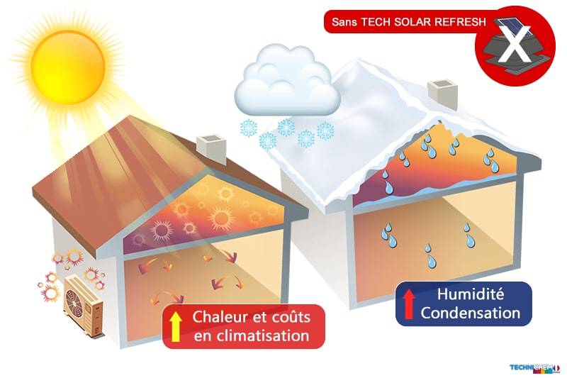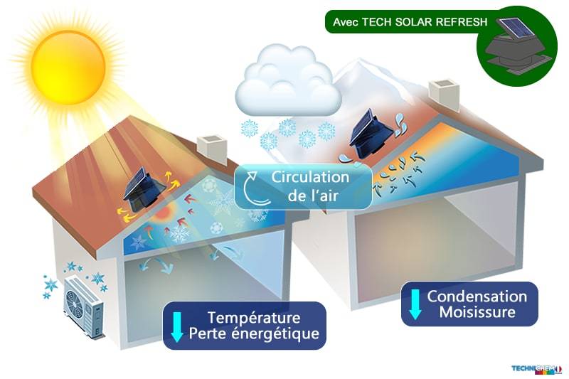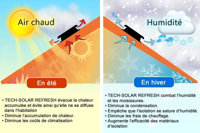 Grâce à TECH-SOLAR REFRESH l'air chaud stagnant dans les hauteurs de votre logement est ventilé et transporté à l'extérieur permettant ainsi de réduire la température, l'humidité et assainir l'air de vos combles et votre logement ...